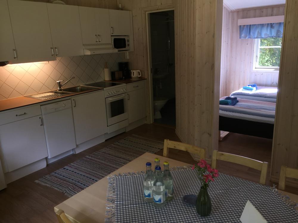 Gäddstugan Deze woning is 23 m2, voor maximaal 3 personen ingericht en ligt in een schitterende omgeving. De woning staat in directe verbinding met Fagelstugan en is daarmee ideaal voor twee families of kleinere groepen die bij elkaar willen verblijven. De afstand tot de boten is ongeveer 300 meter en de tot de receptie 200 meter. Er is een buitenterras van 10 m2, een ingerichte keuken en de woning is met hout gerenoveerd en er is een houtkachel. Er is een dubbelbed en een slaapbank, er is elektrische verwarming, toilet, douche en sauna. De vriezer en sauna worden gedeeld met het naastgelegen Fagelstugan.