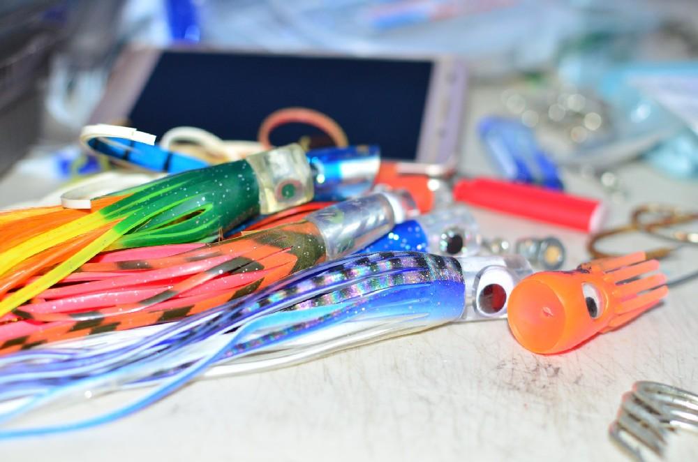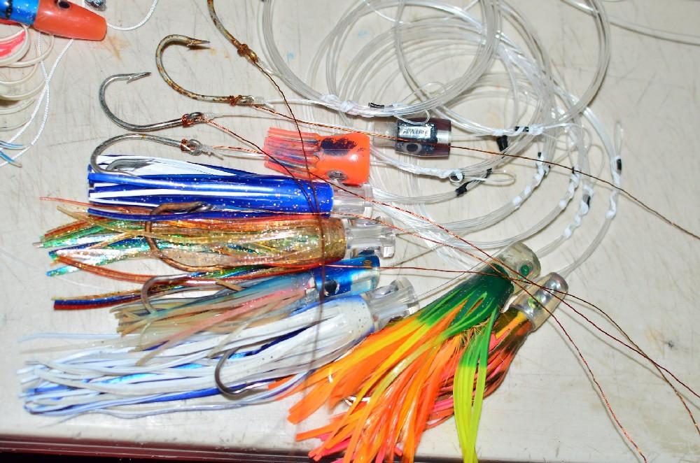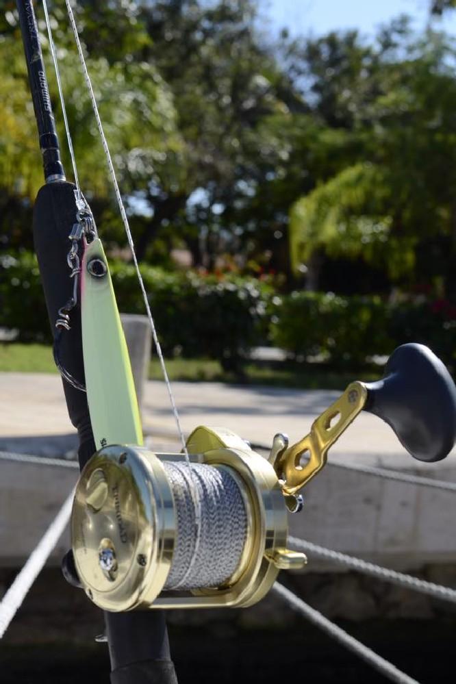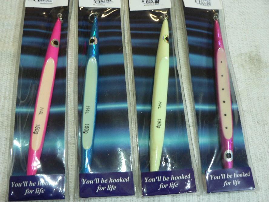 De speedjigs variëren in gewicht van 100 tot 250 gram en de betere kleuren zijn zilver, blauw, roze en groen. Dit zijn met name de natuurlijke kleuren dus. Maar vergeet zeker ook niet de glow kleuren. Zorg dat je rond de 15 jigs per persoon meeneemt. Zo af en toe komt het voor dat een haai of ander gespuis dwars door de fluor carbon heen bijt en je de jig kwijt bent. Een alternatief hiervoor is om er een kort stuk (20 cm) staaldraad voor te zetten, maar dat heeft vaak een negatieve invloed op de vangsten. Het meest gebruikte gewicht is 200 gram.