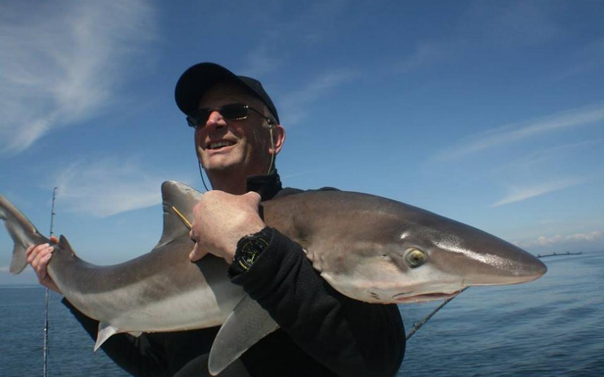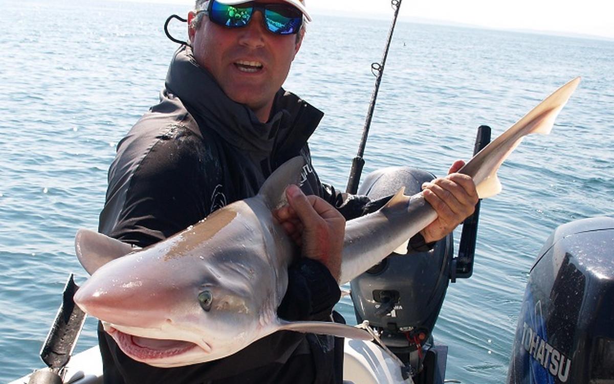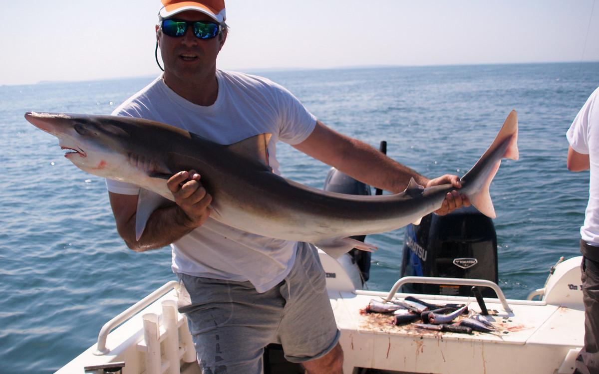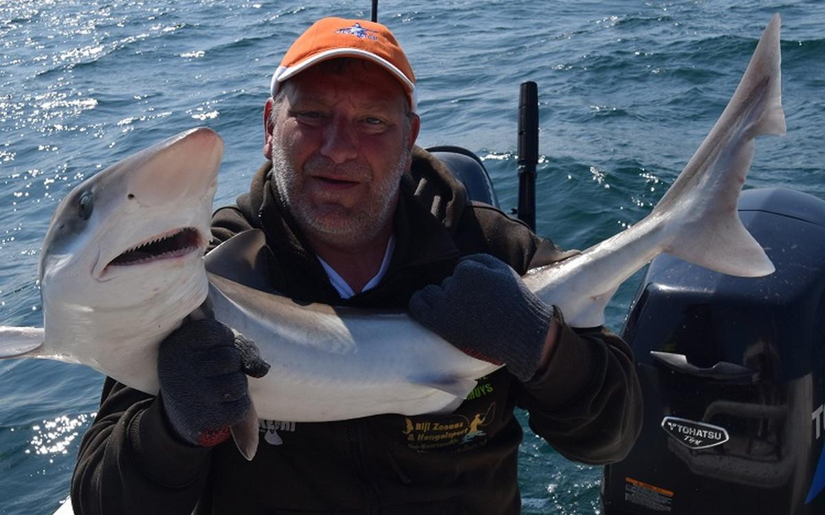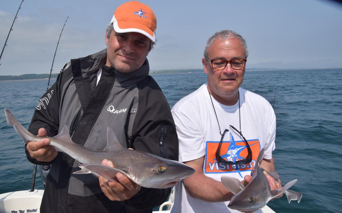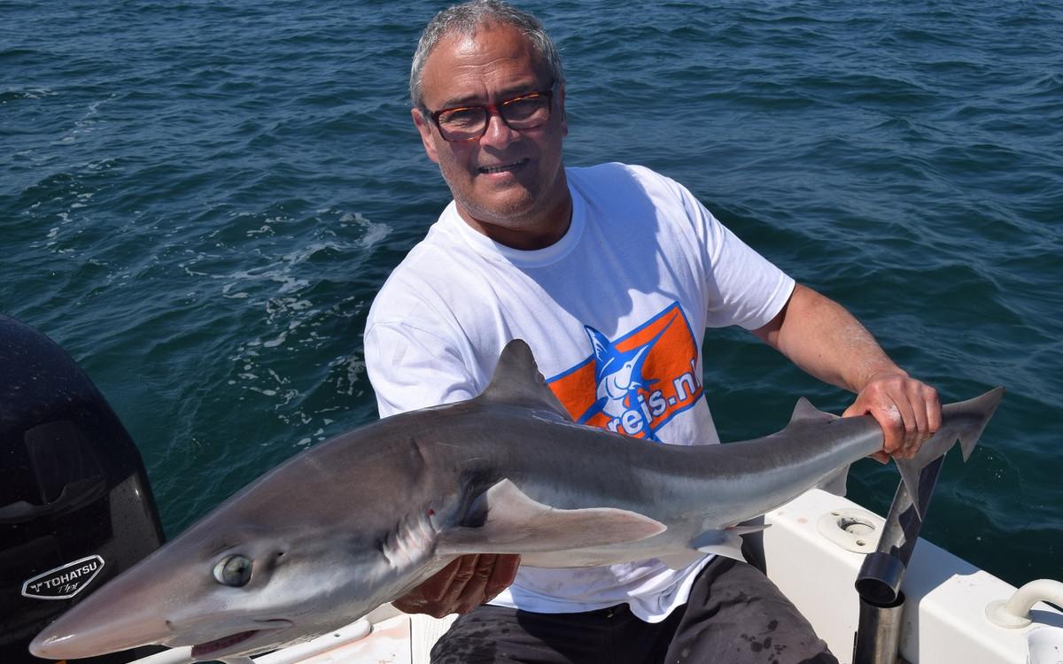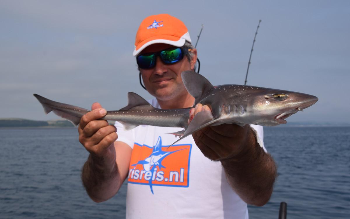 RUWE HAAI Voor de reguliere visserij op haai, rog en pollak kan je met de juiste weersomstandigheden terecht van mei tm oktober. maar een vand e belangrijkste soorten waar men zich hier op richt is toch wel de ruwe haai. Er zijn al weken geweest waarin men meer dan 150 ruwe haaien per boot heeft gevangen. Vroeg in het seizoen wordt er gericht gevist op exemplaren van rond de 10 a 15 kilo ruwe haai in slechts 10 meter diepte met lichte hengels van 6 tot 12 lbs. Dit is werkelijk een super spectaculaire visserij. Maar ook met de dobber wordt er gericht op ruwe haai gevist. In de zomermaanden is de visserij iets verder uit de kust om de grotere exemplaren te lokaliseren van rond de 15 a 20 kilo. Het gemiddelde aantal per dag ligt dan rond de 10 a 12 stuks per boot. In september en oktober worden de aantallen wat lager maar het formaat loopt op tot 25 a 30 kilo. Tijdens het vissen vissen op ruwe haai worden regelmatig bull huss, gladde haai, doornhaai en ook verschillende rogsoorten gevangen. Dit is een zeer welkome bijvangst waarbij de meeste vangsten simpelweg met makreel als aas worden gedaan.